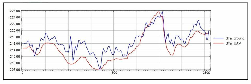 Меньшее влияние шумовИзмерения магнитного поля при пешем передвижении характеризуются существенно более высоким уровнем шумов по отношению к данным аэромагнитных наблюдений с БАС.